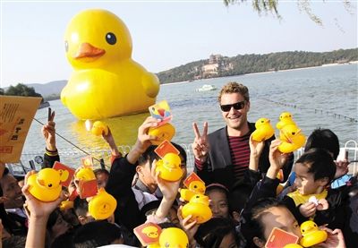 从2007年起憨态可掬的“大黄鸭”开始了自己游历世界的旅程,它曾经到访过11个国家的14座城市。此次从9月6日开始,“大黄鸭”出现在了北京第一站园博园,9月26日又“游到”了颐和园。10月15日,“大黄鸭”北京之旅即将接近尾声时,主办方北京国际设计周组委会与中国鸭迷会启动了“大黄鸭”告别北京的倒计时系列活动。其中,重头戏就是昨日下午举行的“大黄鸭”告别北京现场活动。
