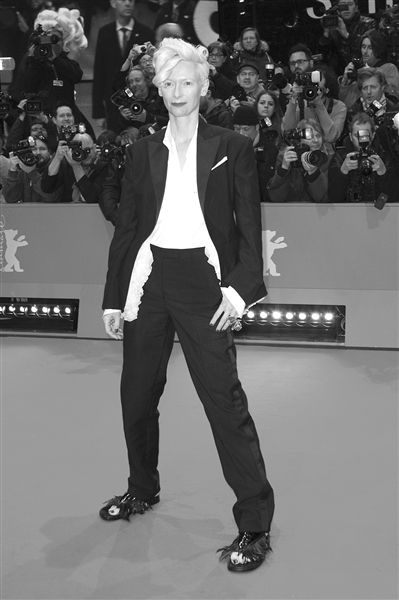 蒂尔达·斯文顿以一身帅气套装亮相红毯。她在开幕影片《布达佩斯大饭店》的老年妆惊呆了小伙伴们。图/CFP