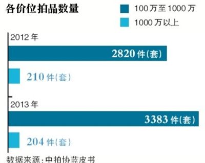 前天,中拍协公布2013年中国拍卖行业经营状况分析及2014年展望蓝皮书,指出2013年中国文物艺术品拍卖市场总成交额为313.83亿元,较2012年增长了11.67%。其中,2013年单件拍品成交额在100万元至1000万元之间的有3383件(套),比2012年增长了19.86%。