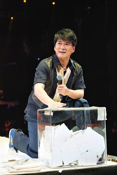 周华健在抽取现场观众的点歌卡,一共抽了十几次,接连送歌7首。