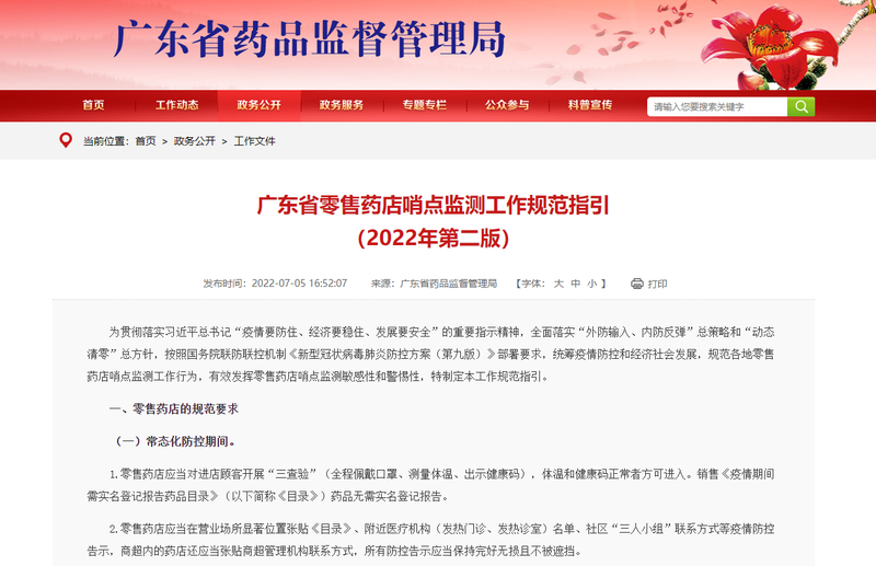 ▲《广东省零售药店哨点监测工作规范指引(2022年第二版)》。截图来自广东省药品监督管理局官网