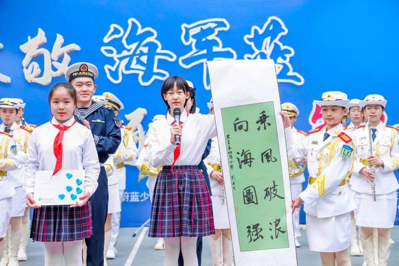 少年军团成员李沛珊代表黑芝麻胡同小学全体师生向海军战士们表达了诚挚的敬意与祝福。六(9)中队少先队员代表刘孟雯献上书法作品《乘风破浪,向海图强》,她表示自己的姥爷年轻时就是一名海军战士,常常给她讲海军的故事,千里江山无限好,从来志在战波涛。宋安淇代表学校全体少先队员送上了一封情真意切的慰问信,信中写到:海军战士们无私奉献、保家卫国、默默无闻的精神值得我们学习,我们也将继续努力,争做新时代的合格建设者和可靠接班人!六(9)中队辅导员王紫峥,以非遗文化为中队特色,带领队员们亲手制作了非遗缠花,将这份珍贵的礼物送给当代最可爱的人——海军官兵。