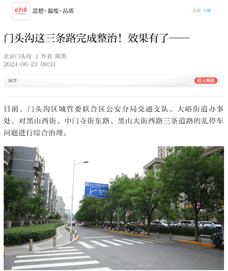 6月23日北京日报客户端报道门头沟区城管委联合区公安分局交通支队、大峪街道办事处,对黑山西街、中门寺街东路、黑山大街西路三条道路的乱停车问题进行综合治理。