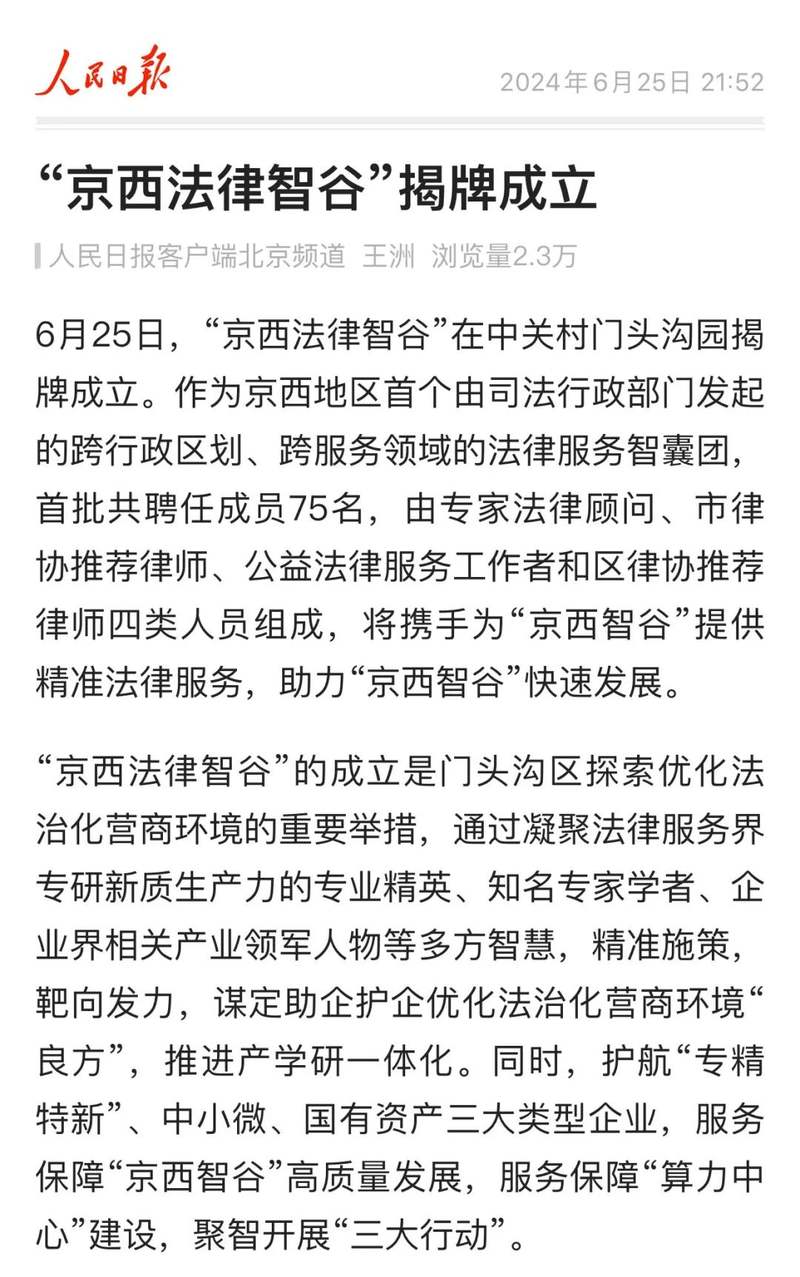 6月25日人民日报客户端报道“京西法律智谷”在中关村门头沟园揭牌成立,将常态化为“京西智谷”提供精准的公益法律服务,助力“京西智谷”快速发展。