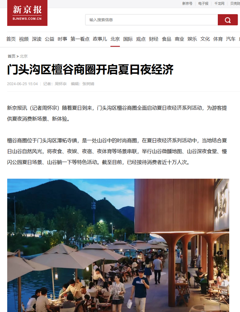 6月25日新京报报道门头沟区檀谷商圈全面启动夏日夜经济系列活动,商圈结合夏日山谷自然风光,将夜食、夜娱、夜宿、夜体育等场景串联,举行山谷微醺地图等特色活动,为游客提供夏夜消费新场景、新体验。