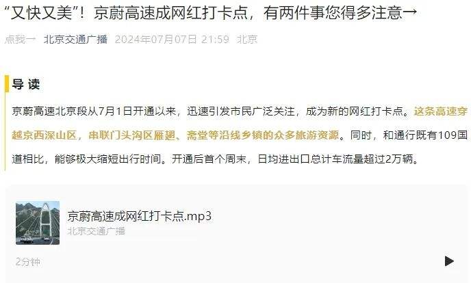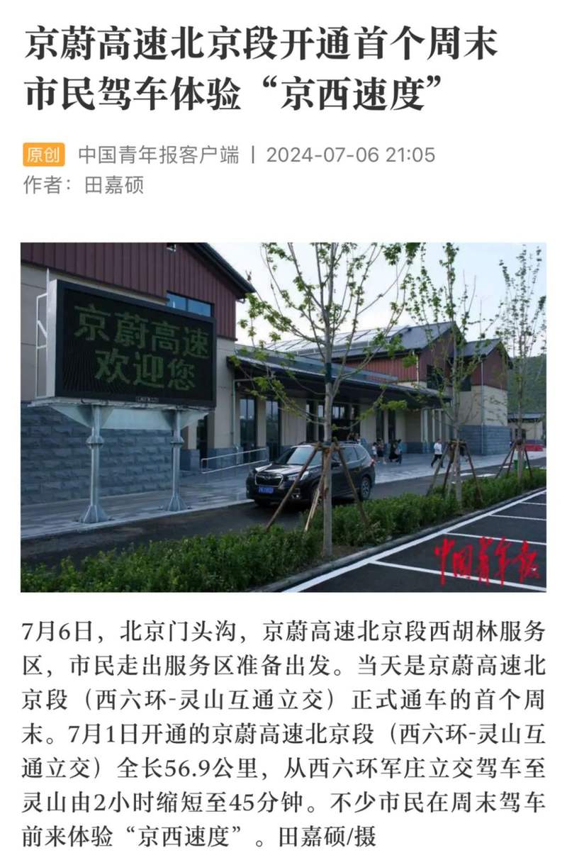 7月6日中国青年报客户端报道,7月6日是京蔚高速北京段(西六环-灵山互通立交)正式通车的首个周末,不少市民驾车前来体验“京西速度”。