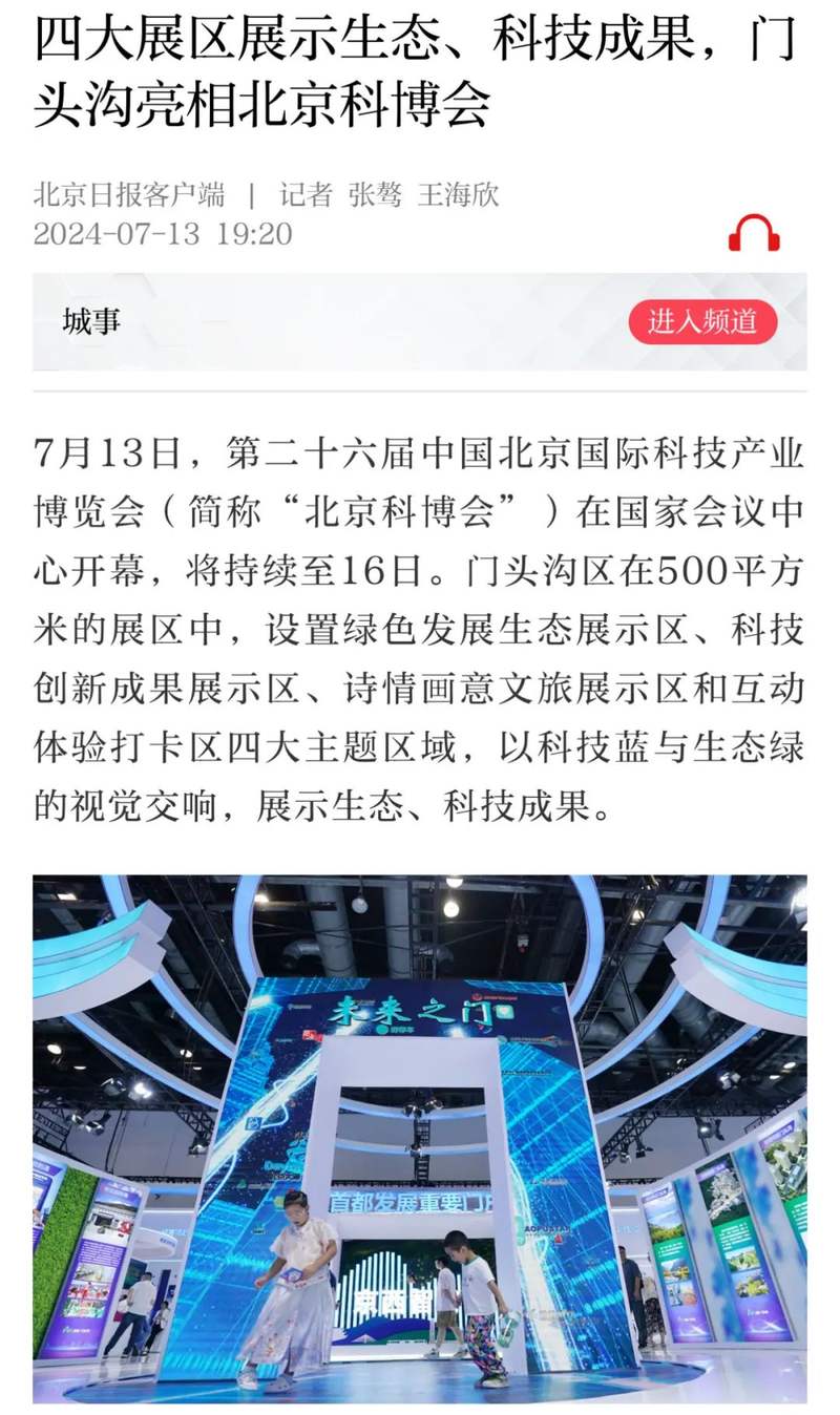 7月13日北京日报客户端报道,第二十六届中国北京国际科技产业博览会(简称“北京科博会”)在北京国家会议中心隆重举办。门头沟区向参观市民展示近年来门头沟区绿色高质量转型发展成果。