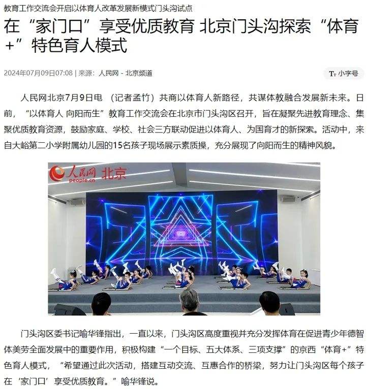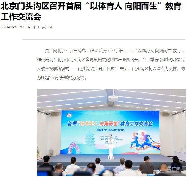 7月9日人民网报道,“以体育人 向阳而生”教育工作交流会在金隅琉璃文化创意产业园召开。会上举行“新时代以体育人改革发展新模式——门头沟试点开启仪式”。
