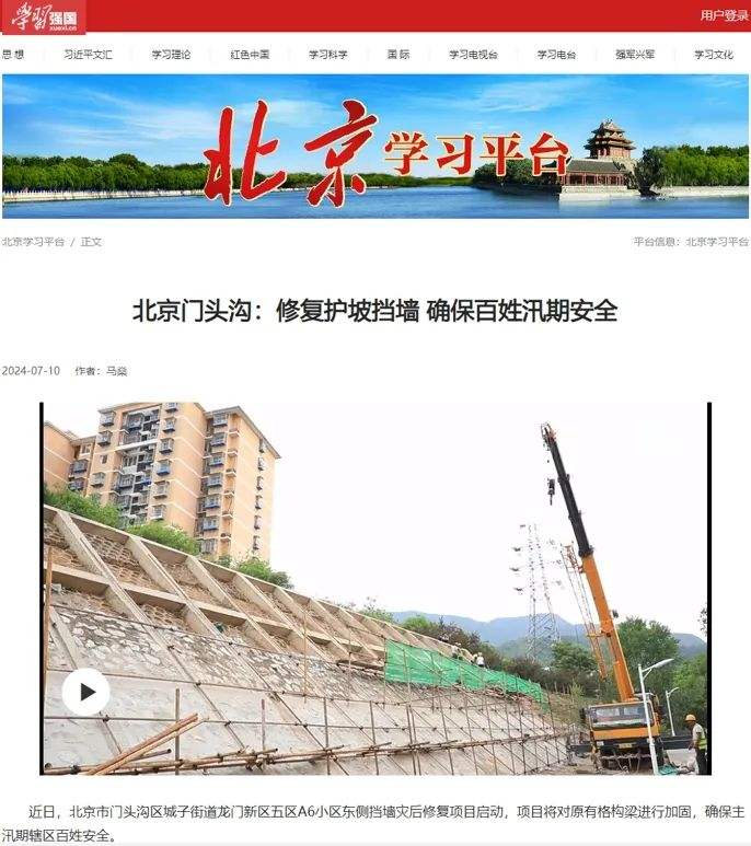 7月10日学习强国平台刊发门头沟记者实地探访城子街道龙门新区五区A6小区东侧挡墙灾后修复项目。