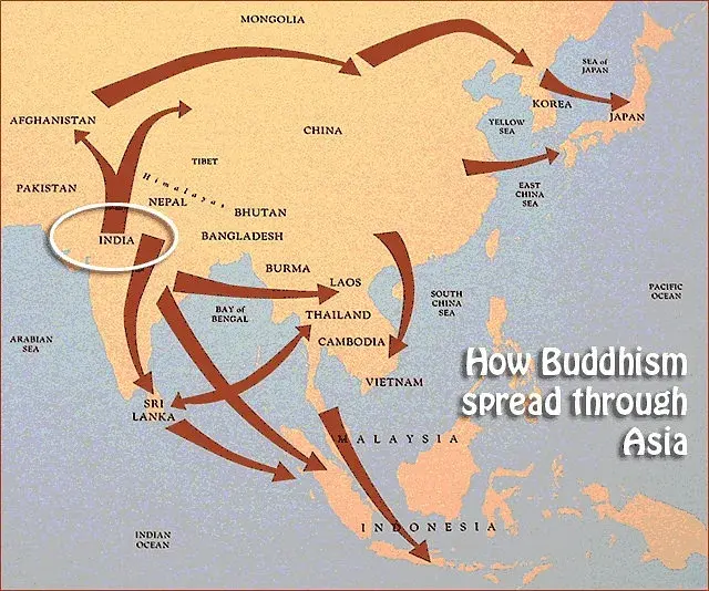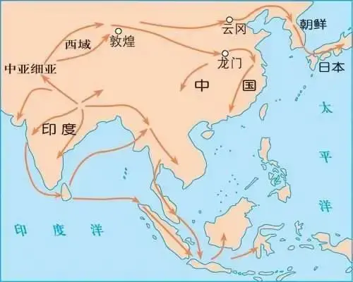 大乘佛教先进入中国,后由中国流传进入朝鲜半岛、日本等地,佛教正式传入中国是在汉朝,佛教的思想既符合统治者们的需求,又与儒家的传统观念贴合,得到了统治政权的推广,甚至派遣使者前往印度求法。
