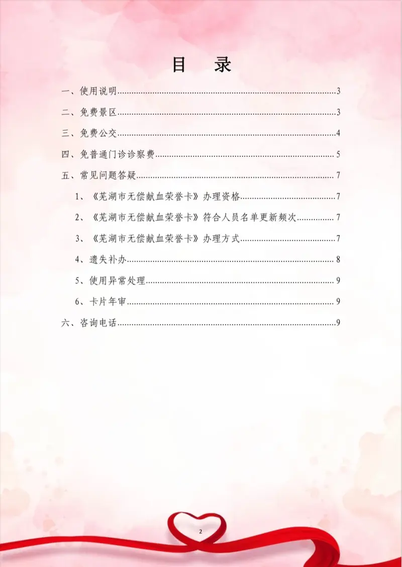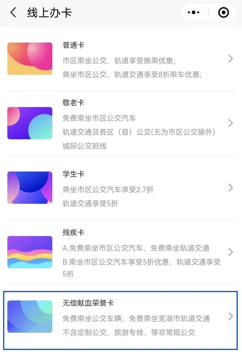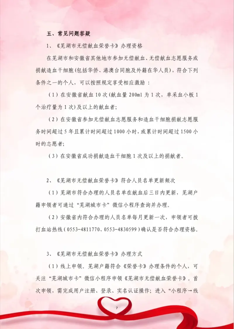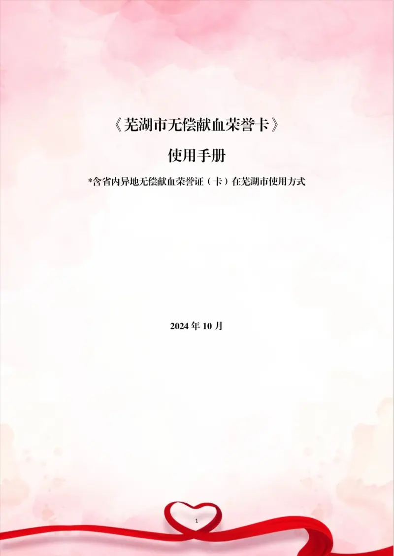 芜湖市符合条件的申领者(芜湖户籍献血满2000毫升)通过“芜湖城市卡”微信小程序申领《芜湖市无偿献血荣誉卡》,统一制作后邮寄至本市接收地址。