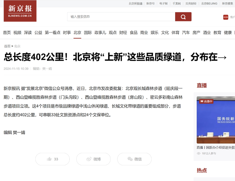 11月15日新京报报道市发改委批复4个市级品牌绿道项目立项,其中包括西山登峰揽胜森林步道 (门头沟段)。该步道长为136公里,连接了天门山、妙峰山等7处景区。