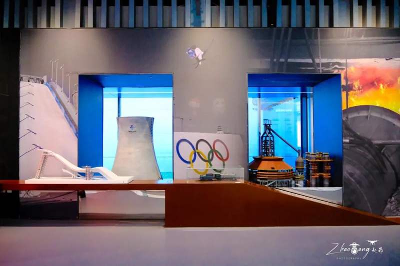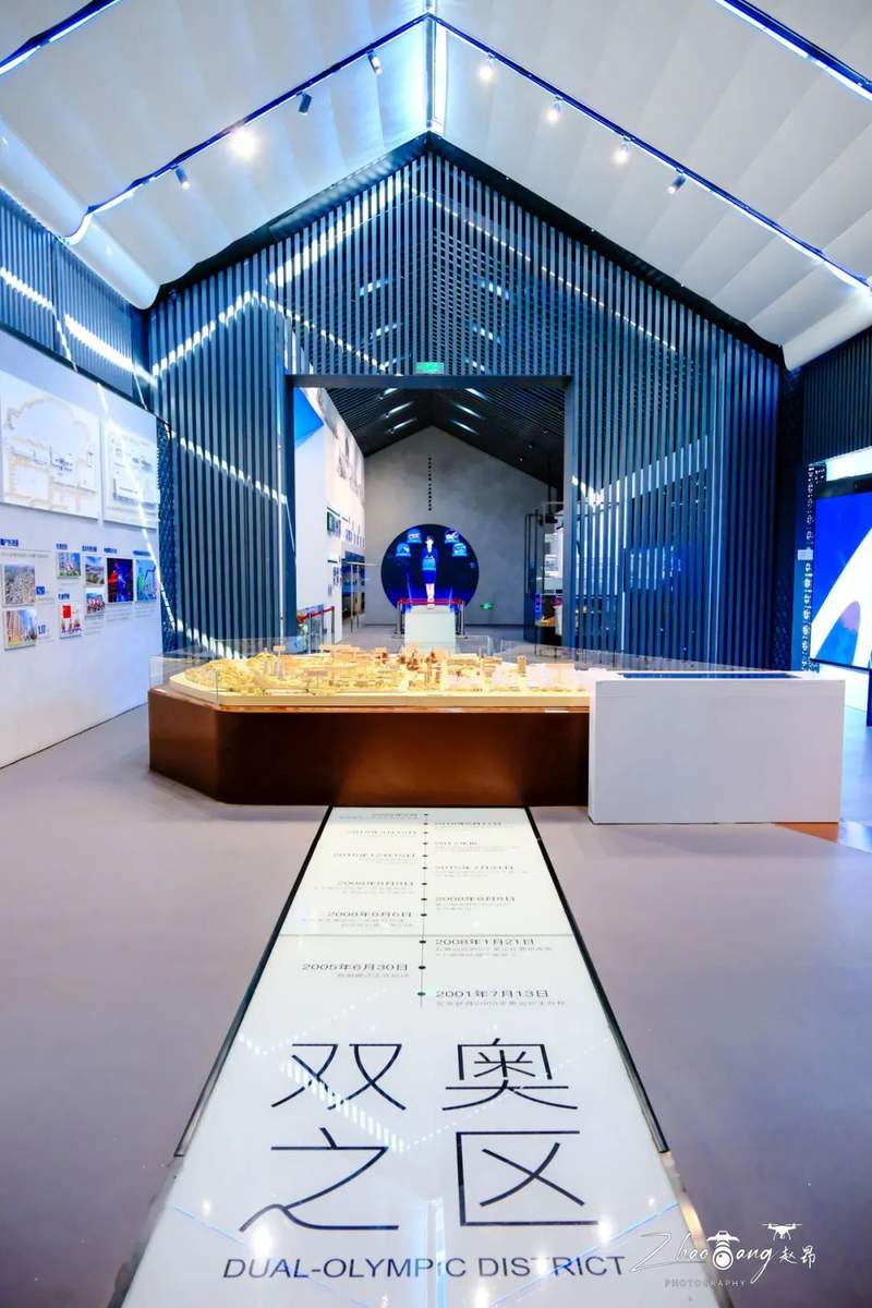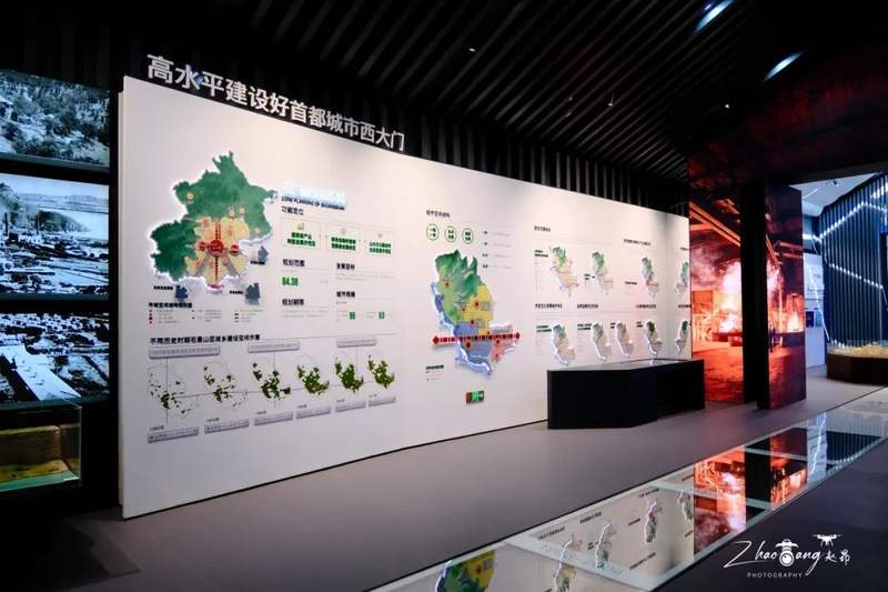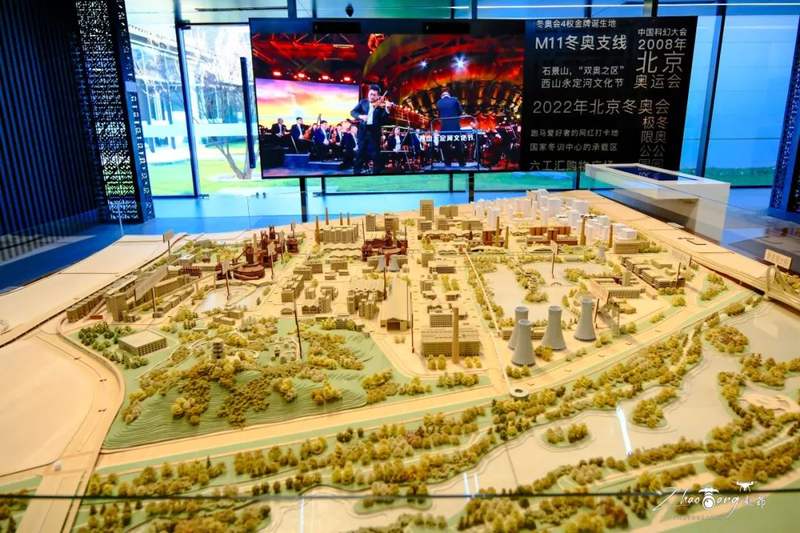 室内参观展厅设置有270°环形巨幅屏幕,流动光影与城市规划沙盘联动,直观展示石景山区“复兴之城、活力之城、美丽之城、品质之城”建设成果。