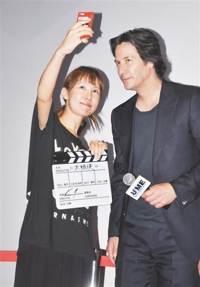 在“超级观影”的现场,基努配合女观众一起自拍。新京报记者 郭延冰 摄