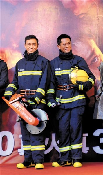 刘青云、古天乐身穿消防员制服出场,二人从肤色来看很像“兄弟”。 新京报记者 秦斌 摄