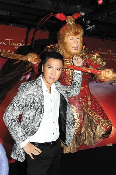 新京报香港讯 (特派记者杨林)昨日中午,3D电影《西游记之大闹天宫》(简称《大闹天宫》)在香港“杜莎夫人蜡像馆”举行特别活动,甄子丹、郭富城、夏梓桐、陈乔恩和张梓琳现场为自己扮演的孙悟空、牛魔王、九尾狐、铁扇公主和女娲的蜡像揭幕。甄子丹和郭富城都表示蜡像和自己太相似,吓了一跳。该活动也预示着这部3D魔幻电影宣传的启动,影片正在紧张做后期,计划在贺岁或春节档以3D和IMAX3D格式国内上映,与冯小刚《私人订制》、成龙《警察故事2013》成为年底主打。