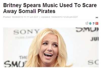 近日,英国《每日镜报》援引一位英国商船舰队官员的说法称,商船会用扬声器直接向索马里海盗播放布兰妮的歌曲,其中《Oops! I Did It Again》和《Baby One More Time》被证明是赶走索马里海盗的最佳歌曲。他认为奥妙在于,“海盗不会理解西方的文化和音乐,而布兰妮的音乐恰恰最合适。”一位爱开玩笑的海运业安全协会官员接受采访时表示:“想象一下,也许某一天播放贾斯汀·比伯的音乐会违反《日内瓦公约》。”