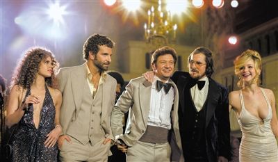 《美国骗局》囊括了艾米·亚当斯、布拉德利·库珀、杰瑞米·雷纳、克里斯蒂安·贝尔、詹妮弗·劳伦斯(左起)等众多明星。