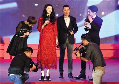 昨日,范冰冰一身红裙亮相,女王范儿引“众星捧月”。新京报记者 郭延冰 摄