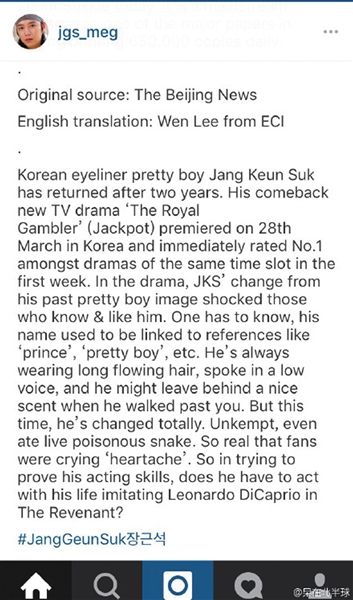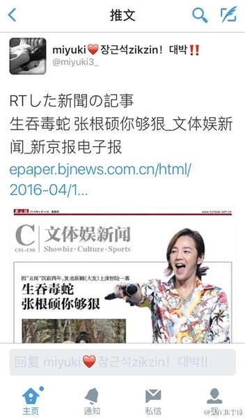 Bkpunkmimi:谢谢新京报真实地报道张根硕!勇于报道真相的报社,值得信赖的报社!张根硕是一个非常敬业的演员,也是非常出色的歌手和MC,更是拥有大爱的慈善家,用他最热情、炙热、真诚的心,全心投入角色里,做任何事都是付出了百分之两百的努力。