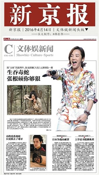 事情是这样的,就是上周四(4月14日),本报文娱版封面报道了张根硕复出拍新剧《大发》的消息,然后有一位名叫“韩影书”的网友主动安利了此事,还把电子版封面和内容做成了长微博(→_→),转给买不到报纸的网友们看;同时文章被翻译成英文版专门推送给海外网友,社交媒体上亦可见日语安利。而那些能买到报纸的,据说就开始扫报亭买买买了,接着小编看到了好多粉丝可爱的合影和表白。有一位在广州的网友,收到北京鳗鱼寄去的新京报后,说要在广州组织读报会,哈哈哈,真是大写的“爱”。