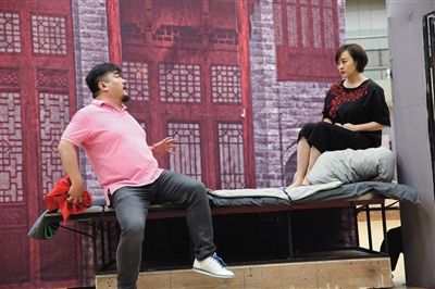 剧中饰演兰花花的赵丽丽(右)和饰演周老爷的关致京在排练中。 大剧院供图
