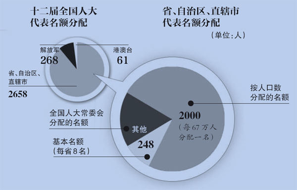 十二届全国人大代表的名额分配,在去年两会上形成了方案:在不超过3000人的名额中,按人口数分配的名额为2000名,也就是每67万人分配一名;每个省区,不论人口多少,都会有8个基本名额,共计248人;剩下的名额由全国人大常委会另行分配。