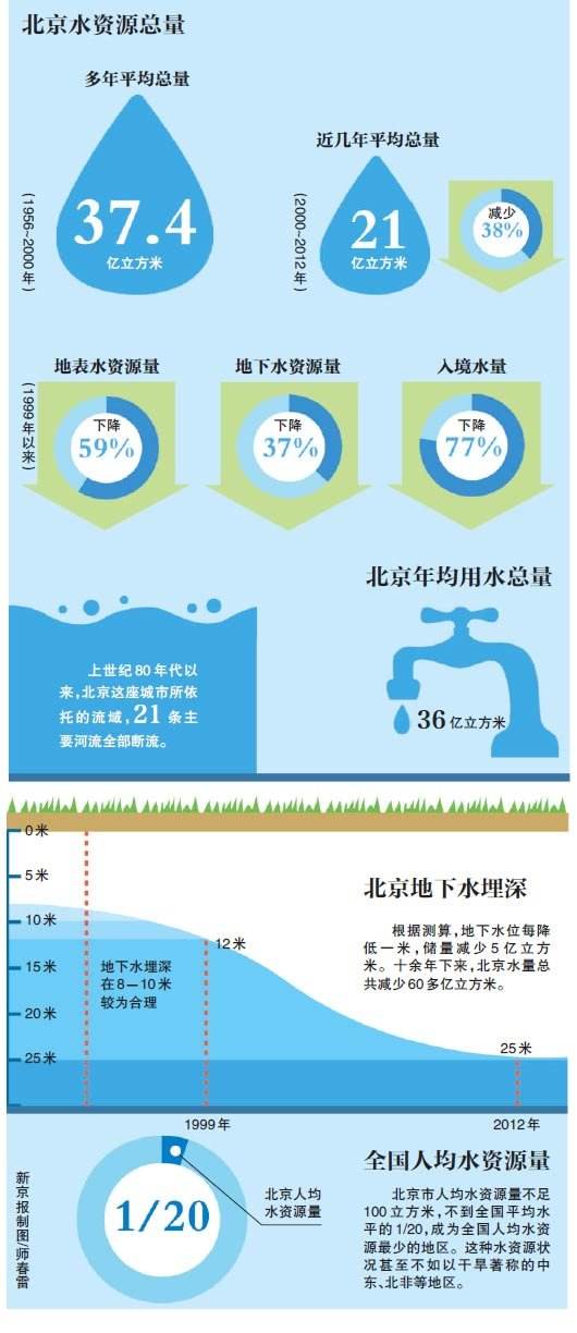 市水务局相关负责人介绍,北京也曾是水资源较为丰富的地区,1956年至2000年,北京多年平均水资源总量37.4亿立方米,但是1999年以来,北京进入连续枯水期。近几年,北京平均用水总量36亿立方米,但年均水资源总量仅21亿立方米,比多年平均减少38%,缺口达到15亿立方米。