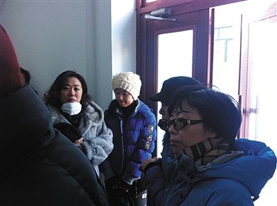 一审开庭时,米女士(右一)等几位幸存者在等候安检。新京报记者 王巍 摄
