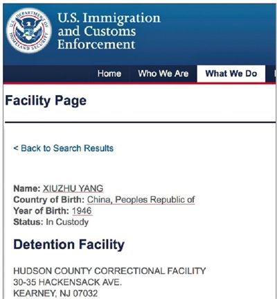 美国移民与海关执法局数据库信息显示,新泽西州哈德逊郡惩教中心在押人员中,有一人与杨秀珠的拼音相同,出生年月也相同。
