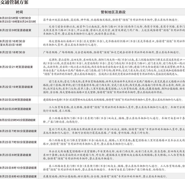 昨日,记者从公安交管局官方网站获悉,北京市公安局发布通告,交通管制措施从22日5时开始,根据预演进展分时、分段采取,涉及北京东城、西城、朝阳、海淀、昌平等多个城区,包括南口、天安门、景山、前门、崇文门、大望路、朝阳公园、工人体育场以及复兴路、建国路等多个地区、多条道路。