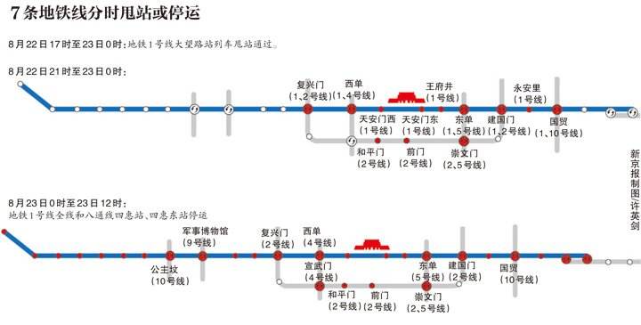 8月22日21时至23日12时,天安门广场周边商业网点、王府井商业步行街、东单商业街(东单北大街)、前门商业步行街、大栅栏商业街、西单商业街(西单北大街)停业。