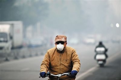 昨日,一位沈阳市民骑行在街头。当日,沈阳遭遇严重雾霾天气。新华社记者 姚剑锋 摄