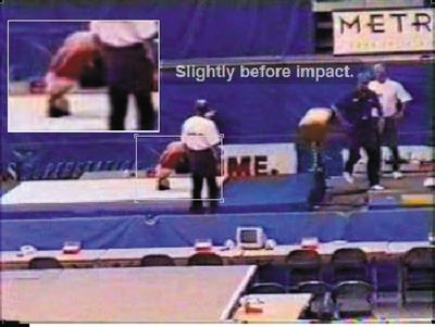 桑兰:通过这几个截图,的确贝鲁站在跳马旁,但是这并不能说明他没有时间站到这里。我受伤在热身当中,而不是正式比赛。这块垫子是在运动员热身时候加上去进行保护的。而1998年的现场图拿过来看不到那个垫子,原因是有高台。