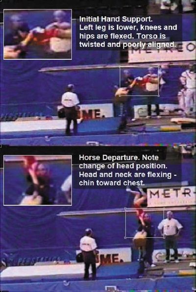 离开鞍马,注意头部位置变化。头部和颈部位置弯曲,下颏向着胸部。