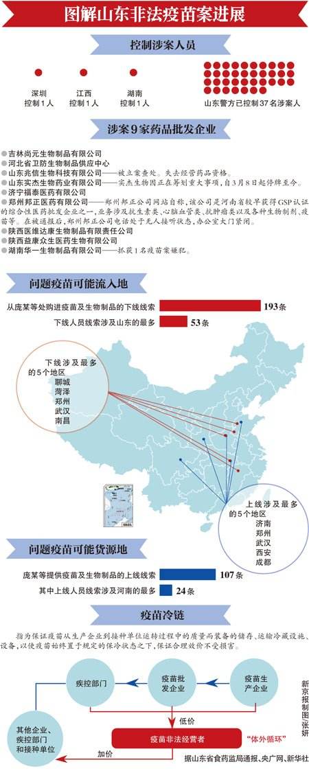 昨日,最高检挂牌督办非法经营疫苗系列案。山东控制37名涉案人员。食药监总局通报的9家涉嫌虚构疫苗销售渠道的药品批发企业中,其中一家山东药企被取消经营药品资格。