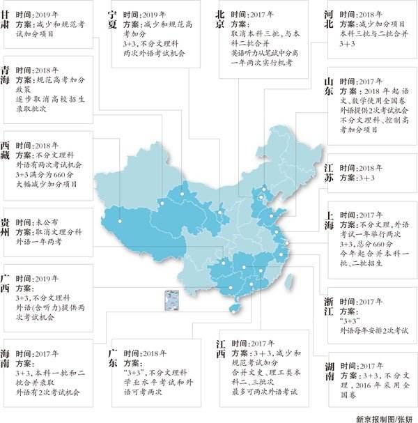 新京报记者梳理16省份方案,“3+3”高考模式成趋势,改革招生批次和科目设置为重点