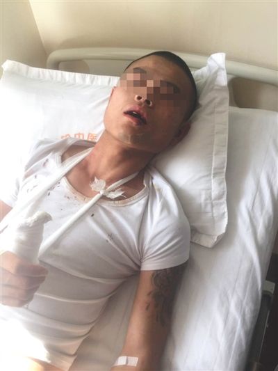 3日,记者在北京年轮中医骨科医院看到了躺在病床上的张先生,他全身多处有刀伤,左手大拇指手筋被砍断,用纱布包扎着,白色衣服上可见血痂。