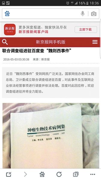 记者浏览网站发现,新京报于5月3日凌晨3时30分发表的《联合调查组进驻百度查“魏则西事件”》与大众网同日上午9时03分刊发的名为《魏则西事件始末:涉事医院究竟有无资质》中,所用图片、文字内容均与新京报作品一致,网页上方的来源处写有新京报的名字,作者一栏为空白。