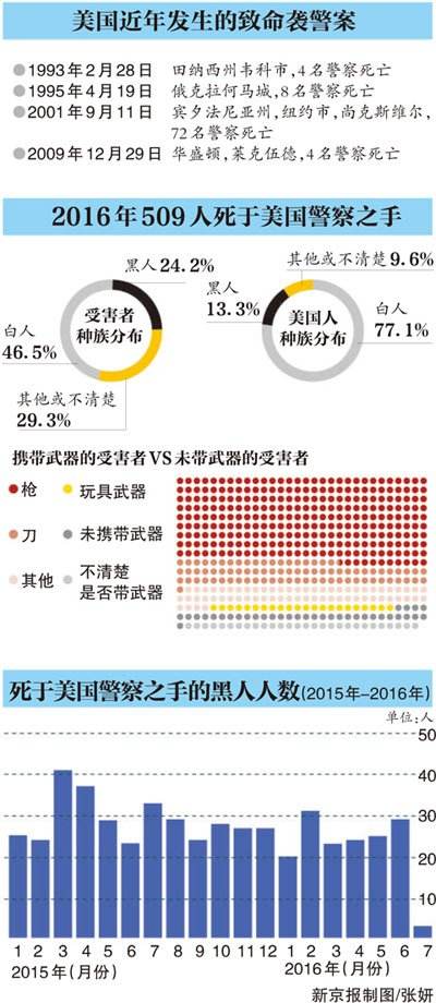 本月5日和6日,美国路易斯安那州和明尼苏达州接连发生警察枪杀非洲裔男子的事件,相关现场视频引发美国民众对警察暴力执法、种族歧视的愤怒。除达拉斯外,华盛顿、纽约、芝加哥、洛杉矶等地7日同样爆发抗议活动。