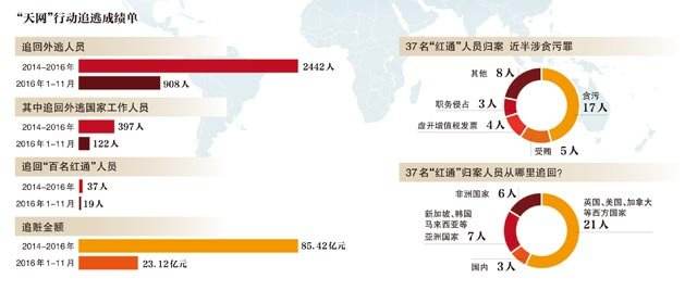 据统计,2014年以来,我国设立中央反腐败协调小组国际追逃追赃工作办公室,先后开展“天网2015”“天网2016”专项行动,从70多个国家和地区追回2442人,其中国家工作人员397人,“百名红通”人员37人,追赃金额85.42亿元。