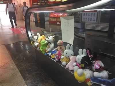 昨日,商场入口处,紧挨着电梯扶手摆放着一排娃娃,10元三个。西城区供图