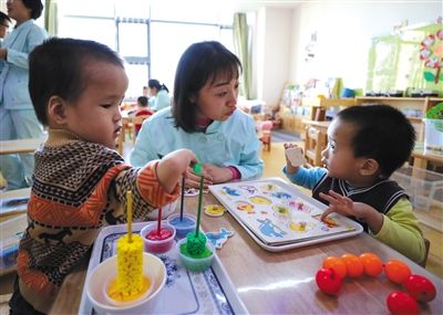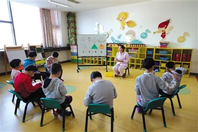 昨日,北京市儿童福利院,老师在培训孩子的分辨能力。