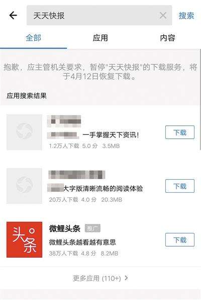 4月9日,部分安卓商店已不能下载今日头条、天天快报等APP。 手机截屏