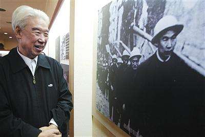 2004年10月3日,正在北京中国国家博物馆展出的“红旗渠精神展”吸引了众多观众。原林县县委书记杨贵到场参观并和当年自己带队修建红旗渠时拍摄的老照片合影。图/视觉中国