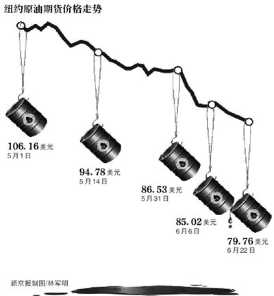 21日收盘时,纽约商品交易所8月交货的轻质原油期货价格大跌3.25美元,收于每桶78.20美元,跌幅为3.99%,为去年10月6日以来的最低水平。8月交货的北海布伦特原油期货价格则大跌3.46美元,收于每桶89.23美元,跌幅为3.73%,创2010年12月份以来的最低水平。