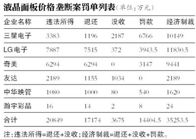 新京报讯 (记者钟晶晶)国家发改委昨日披露,近日对6家液晶面板企业合谋操纵价格的价格垄断行为做出总额高达3.53亿元的处罚,6家企业包括韩国三星、LG以及我国台湾地区的奇美、友达、中华映管、瀚宇彩晶。这是发改委首度对境外企业价格垄断行为做出处罚决定,也是迄今为止对价格违法行为开出的最大罚单。