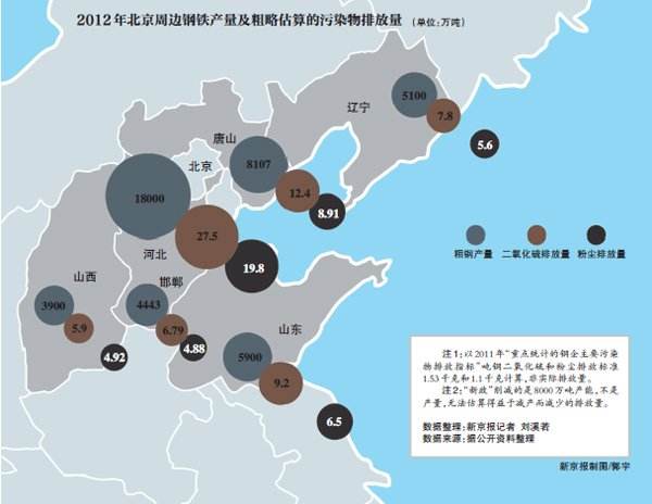 统计数据显示,2012年我国粗钢产量超过7亿吨,来自辽宁、河北、山西、山东等北京附近的四省份,产量就达到3.29亿吨,约占全国产量的46%。