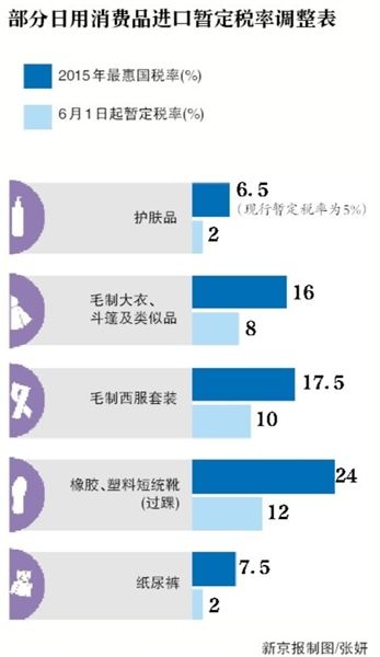 新京报讯 (记者李蕾)大规模代购和海外出游购物的热潮有望缓解。财政部5月25日宣布,自6月1日起,我国降低部分服装、鞋靴、护肤品、纸尿裤等日用消费品的进口关税税率,平均降幅超过50%。