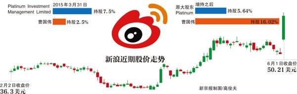 截至6月1日美股收盘,新浪股价涨9.48美元至50.21美元,涨幅达23.28%。彭博社报道称,已创下新浪11年来最大涨幅。受此带动,微博当日亦上涨6.5%,报16.88美元。
